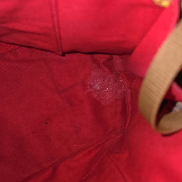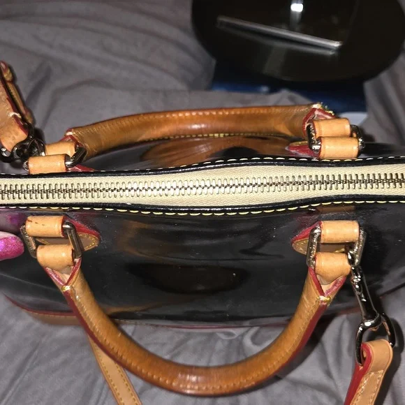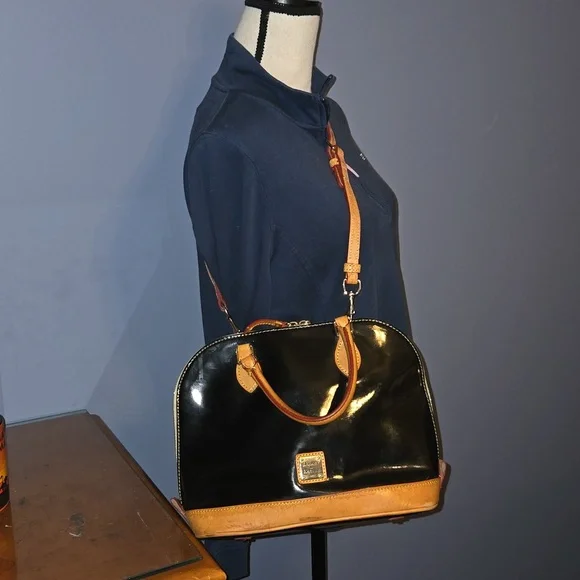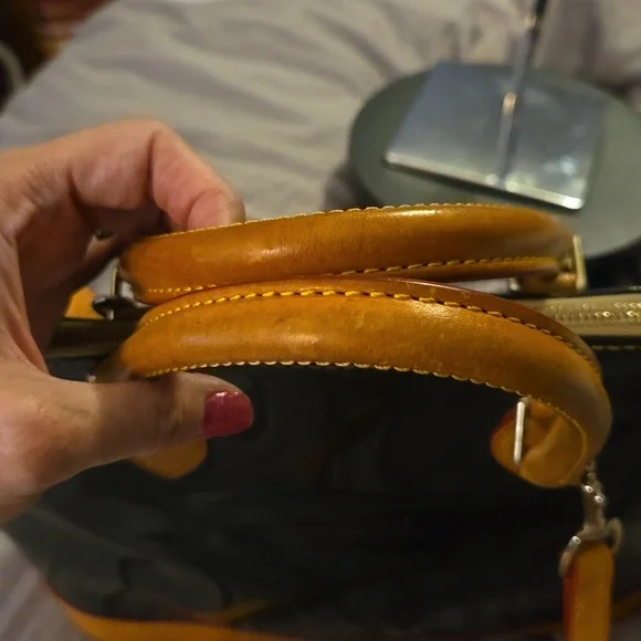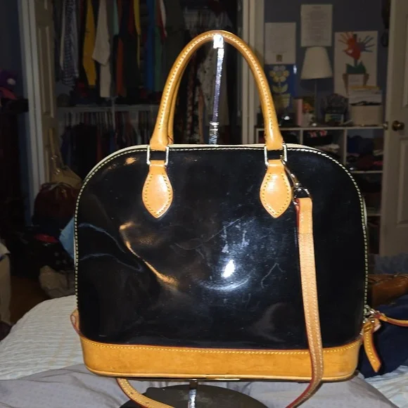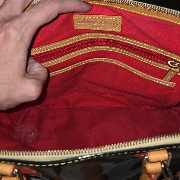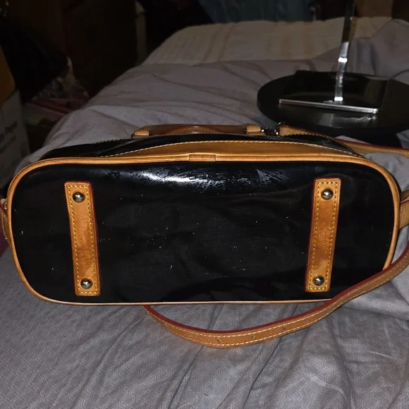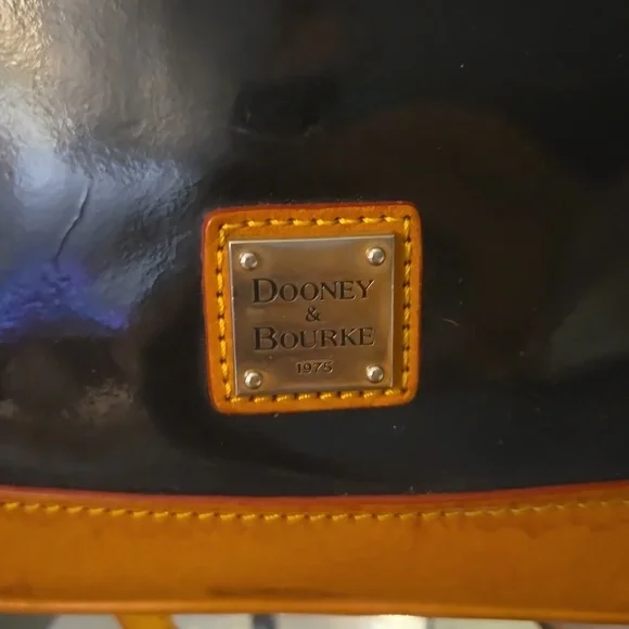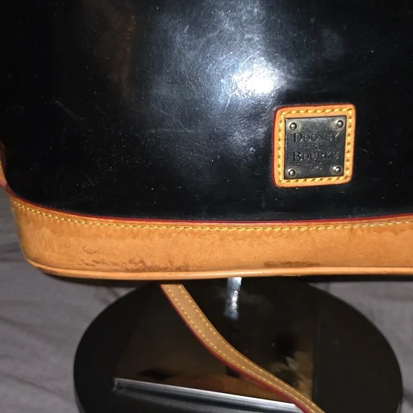 Dooney and Bourke vintage dome satchel patient and tan leather with red interior. There are 2 call outs: a stain on the inside (easy clean), slight discoloration on leather. See all the photos. The dome bag has a full double zipper top. Comes with original crossbody. The inside has a zipper pocket, pocket, and 2 slip pockets. Bottom has 4 feet.GUCSEE PHOTOS FOR CALL OUTS SAME DAY SHIPPING