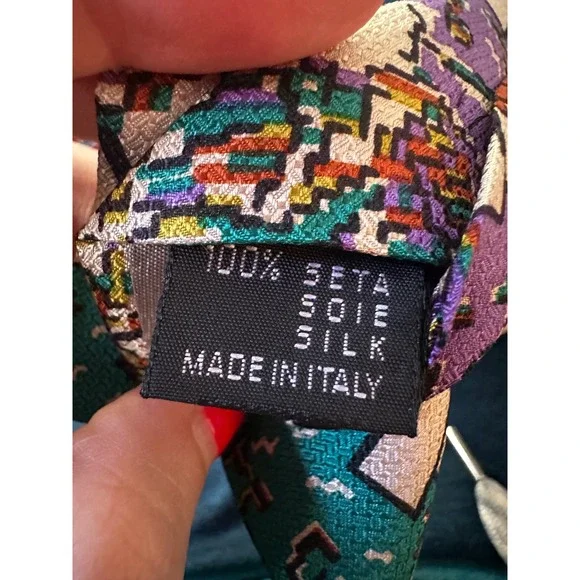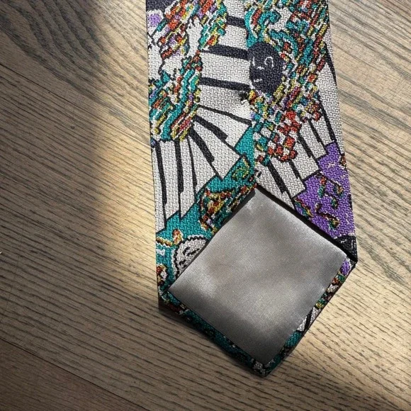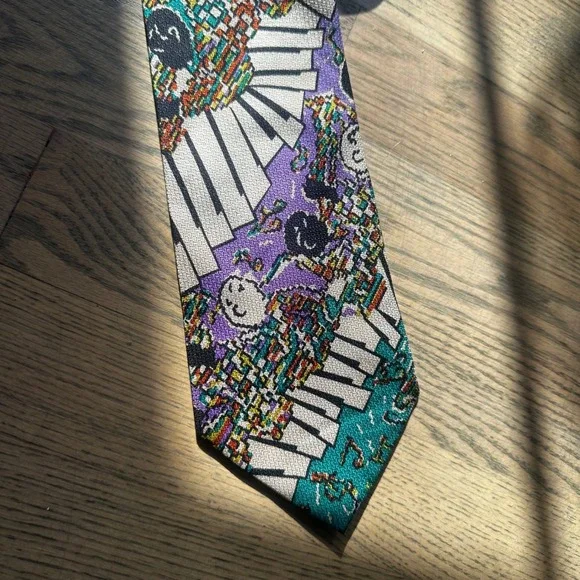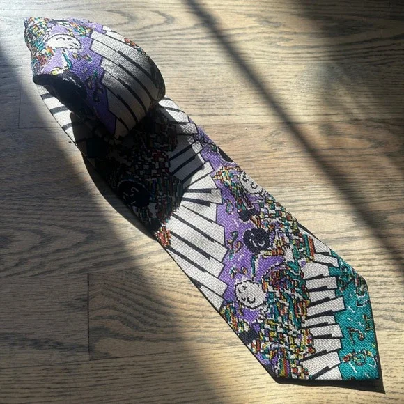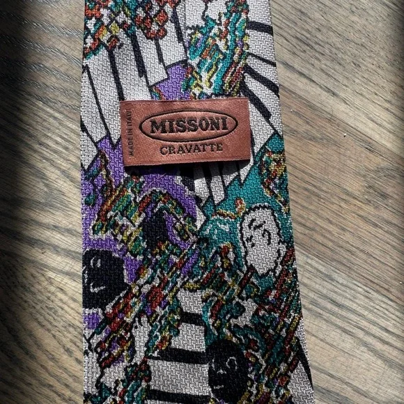 Command attention with this striking abstract Missoni Cravatte necktie, a symphony of style and sophistication. This eye-catching piece features a playful design of piano keys and musical notes, rendered in a vibrant palette of teal, purple, and beige. The intricate detailing and luxurious feel elevate any ensemble, making it a true statement accessory. Whether you're attending a jazz club performance, adding flair to your office attire, or seeking a conversation starter at a social gathering, this tie will strike the perfect chord.Color: MulticolorDepartment: MenType: TieMaterial: Silk, 100% SilkStyle: DesignerPattern: GeometricCharacter: Musical, Piano Player, Pianist, Music NoteAccents: LogoFabric Type: Silk BlendKeywords: Missoni, Cravatte, Tie, Necktie, Silk Tie, Men's Tie, Novelty Tie, Piano Keys, Musical Notes, Designer Tie, Vintage Tie, Retro Tie, Purple Tie, Teal Tie