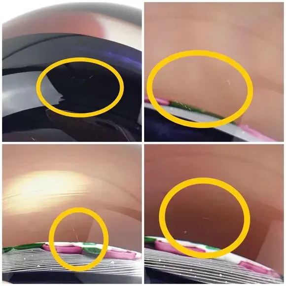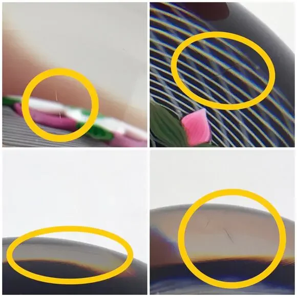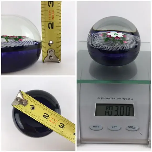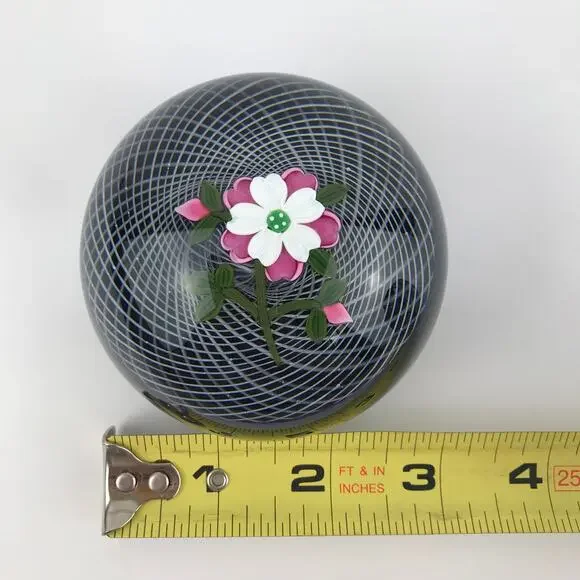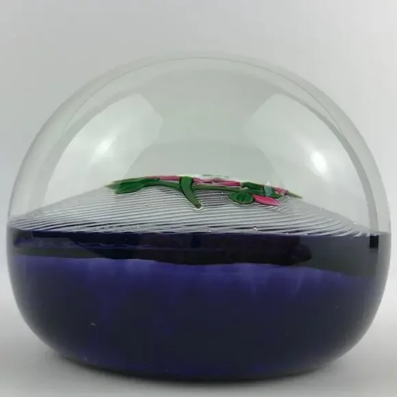 Perthshire 1991E Pink and White Rose Lampwork Flower Latticinio Dome PaperweightVintage Perthshire glass art paperweight, lampwork pink and white rose flower with two buds set on spiral latticinio cushion, translucent dark amethyst ground, domed version, signed with a "P1991" cane in base, part of the Annual Collection, edition size: 241 made, collectible paperweight/home decorPre-owned condition; SOME SCRATCHES/WEAR/SCUFFS ON BASE, SOME SCRATCHES THROUGHOUT (INCLUDING ON TOP OF DOME), STRIATIONS/BUBBLES THROUGHOUT (see last 5 photos for examples of flaws/wear)See photos for detailed measurements and weight