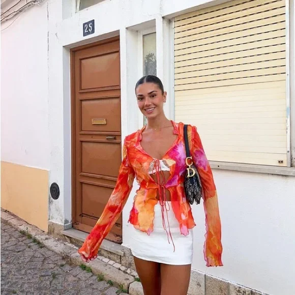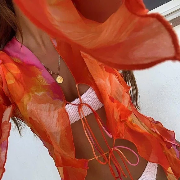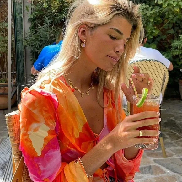 RAT & BOA Fiametta Blouse - XSLike NewA signature Rat and Boa shape conjured in dreamy sunset shades, Fiametta is made for steamy days and far flung adventures.Your favourite flirty blouse remixed in a warm pink and orange print, Fiametta's delicate ties and subtle frills are made for steamy days and far flung adventures.Front tie fasteningsSemi sheerFrill detail